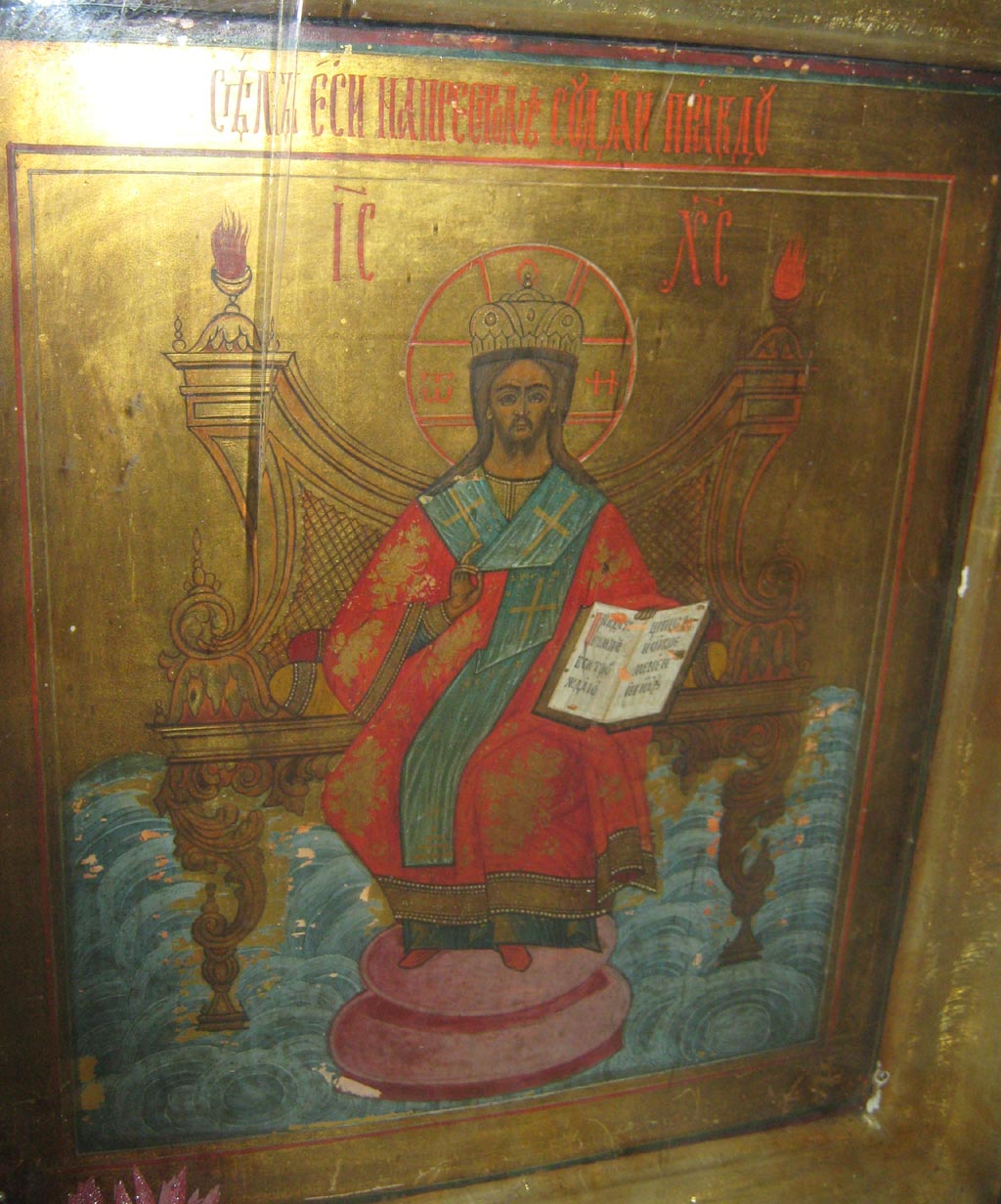 она не сказала. На иконе изображён святой, сидящий на троне, в одной