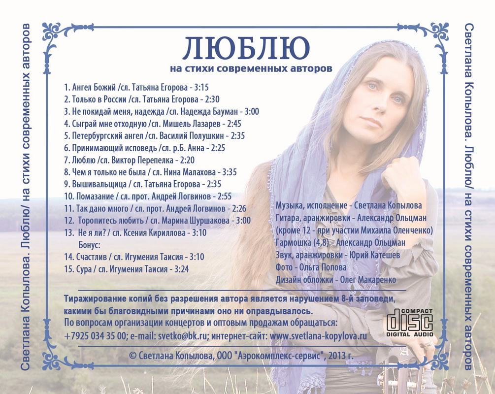 01. Ангел Божий / сл. Татьяна Егорова (mp3 - 3,1 Мб) 02. Только в России / сл. Татьяна Егорова (mp3 - 2,3 Мб) 03. Не покидай меня, надежда / сл. Надежда Бауман (mp3 - 2,8 Мб) 04. Сыграй мне отходную / сл. Мишель Лазарев (mp3 - 2,6 Мб) 05. Петербургский ангел / сл. Василий Полушкин (mp3 - 2,5 Мб) 06. Принимающий исповедь / сл. р. Б. Анна (mp3 - 2,3 Мб) 07. Люблю / сл. Виктор Перепелка (mp3 - 2,2 Мб) 08. Чем я только не была / сл. Нина Малахова (mp3 - 3,4 Мб) 09. Вышивальщица / сл. Татьяна Егорова (mp3 - 2,5 Мб) 10. Помазание / сл. прот. Андрей Логвинов (mp3 - 2,8 Мб) 11. Так дано много / сл. прот. Андрей Логвинов (mp3 - 2,7 Мб) 12. Торопитесь любить / сл. Марина Шуршакова (mp3 - 2,9 Мб) 13. Не я ли? / сл. Ксения Кириллова (mp3 - 3,0 Мб) 14. Счастлив / сл. Игумения Таисия (mp3 - 3,0 Мб) 15. Сура / сл. Игумения Таисия (mp3 - 3,1 Мб) Компакт-диск Светлана Копылова "Люблю" (На стихи современных авторов) Издательство: ООО "Аэрокомплекс-сервис" Время звучания 44 мин. Светлана Копылова — музыка, исполнение Александр Ольцман — аранжировки, гитара (кроме 12 - при участии Михаила Оленченко) Юрий Катешев — звук (студия Василия Богатырева «COSMOSSTUDIO») Источник: http://www.svetlana-kopylova.ru/ Поддерживайте создателей христианской музыки - покупайте лицензионные диски. Ищите в продаже в интернет магазинах.