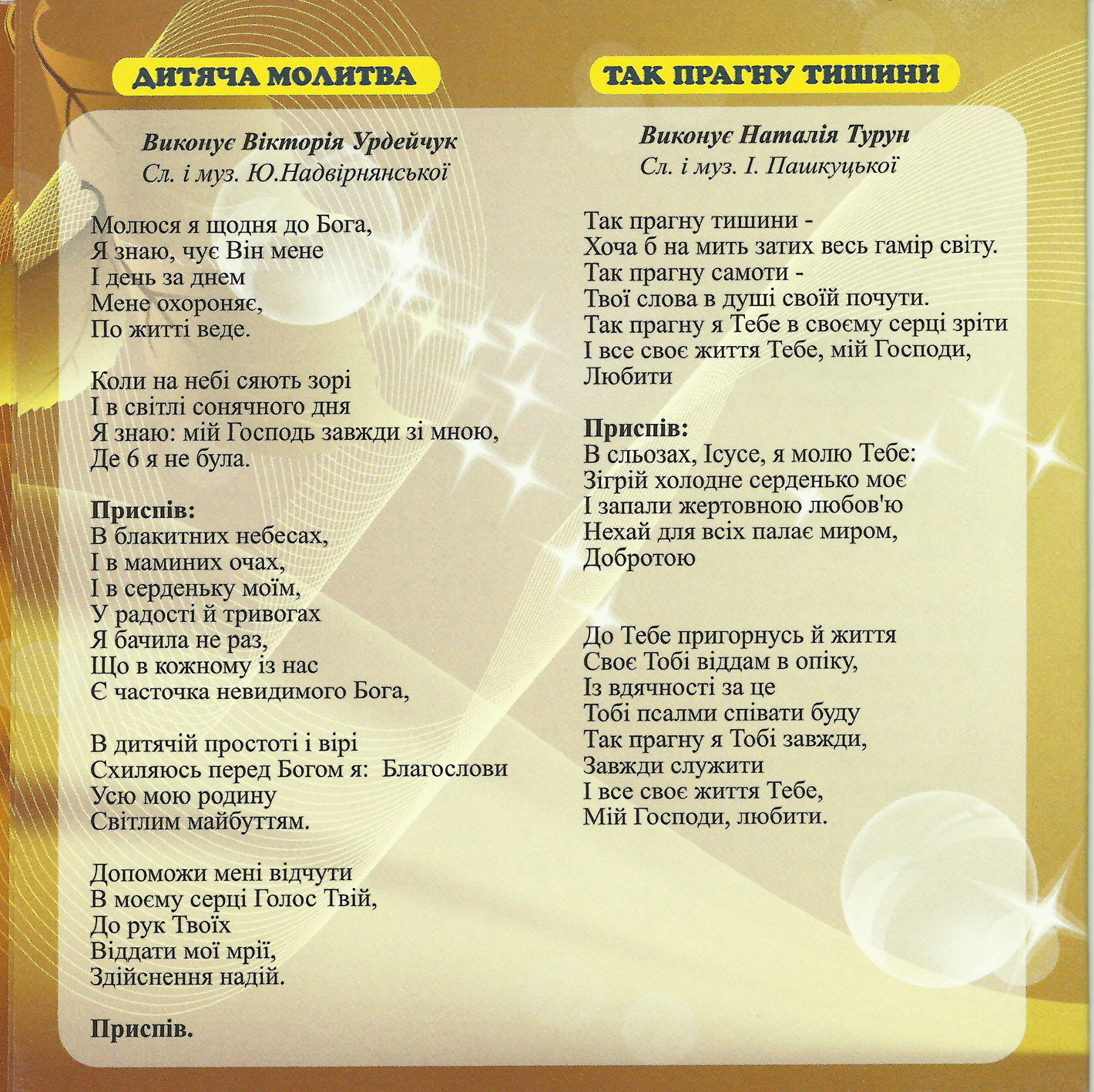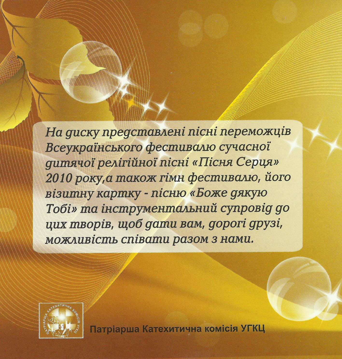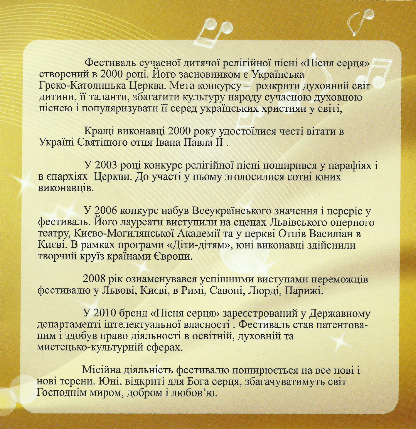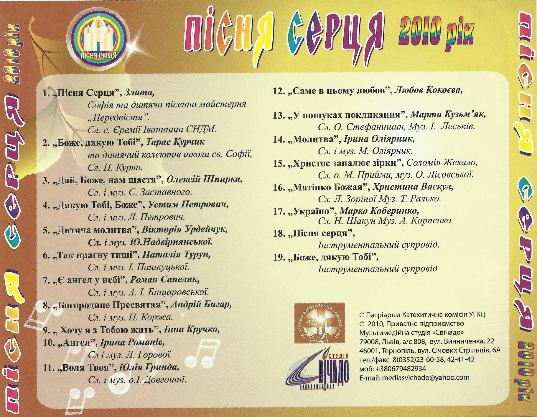 Формат flac (без втрати якості) 1. Пісня серця 10. Ангел 11. Воля Твоя 14. Молитва 16. Матінко Божая 17. Україно 18. Пісня серця (інструментальна) 19. Боже, дякую Тобі (інструментальна) Слухайте також: Поддерживайте создателей христианской музыки - покупайте лицензионные диски. Ищите в продаже в интернет магазинах.