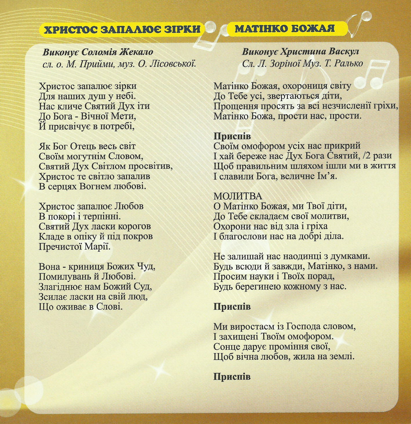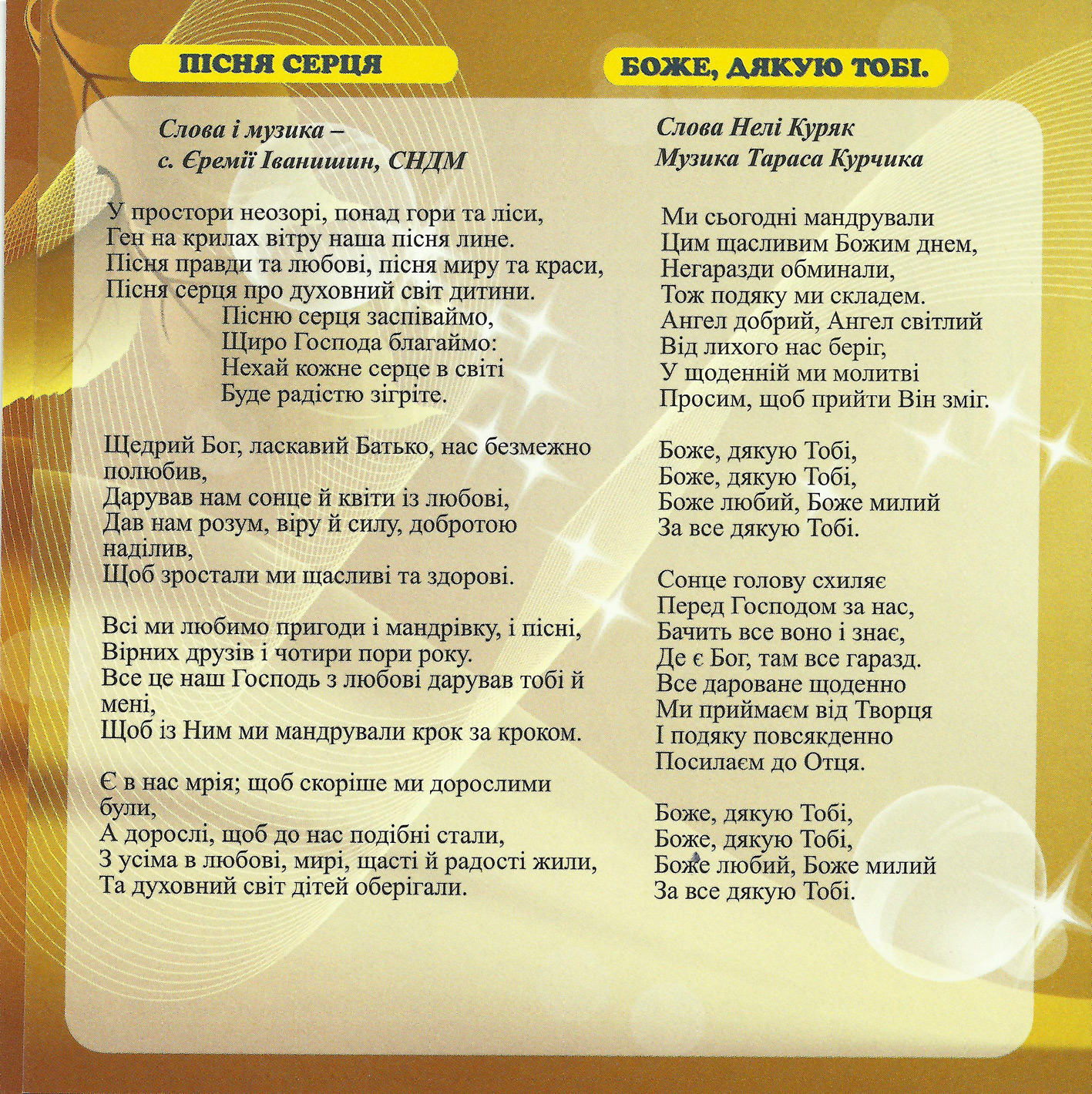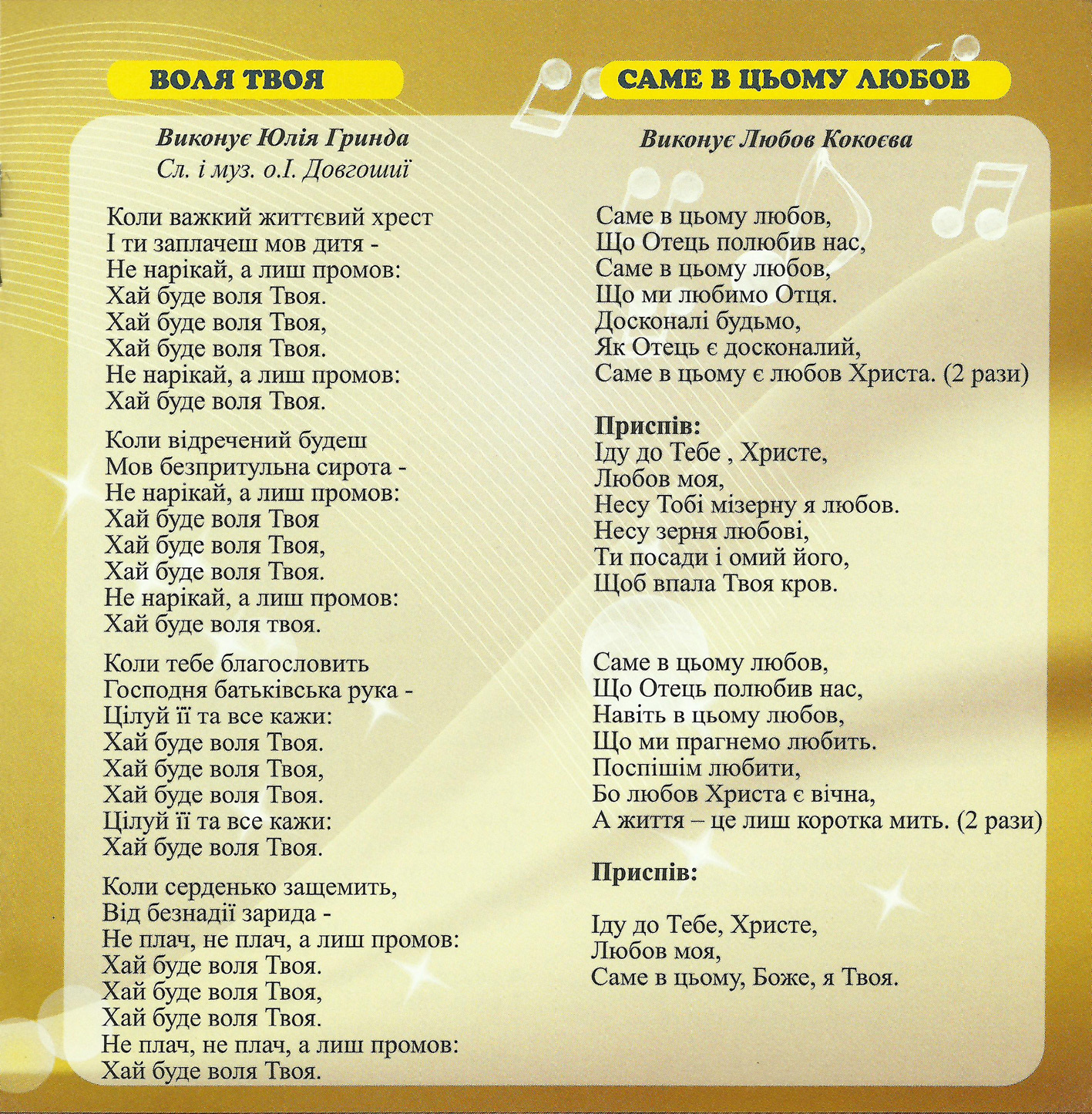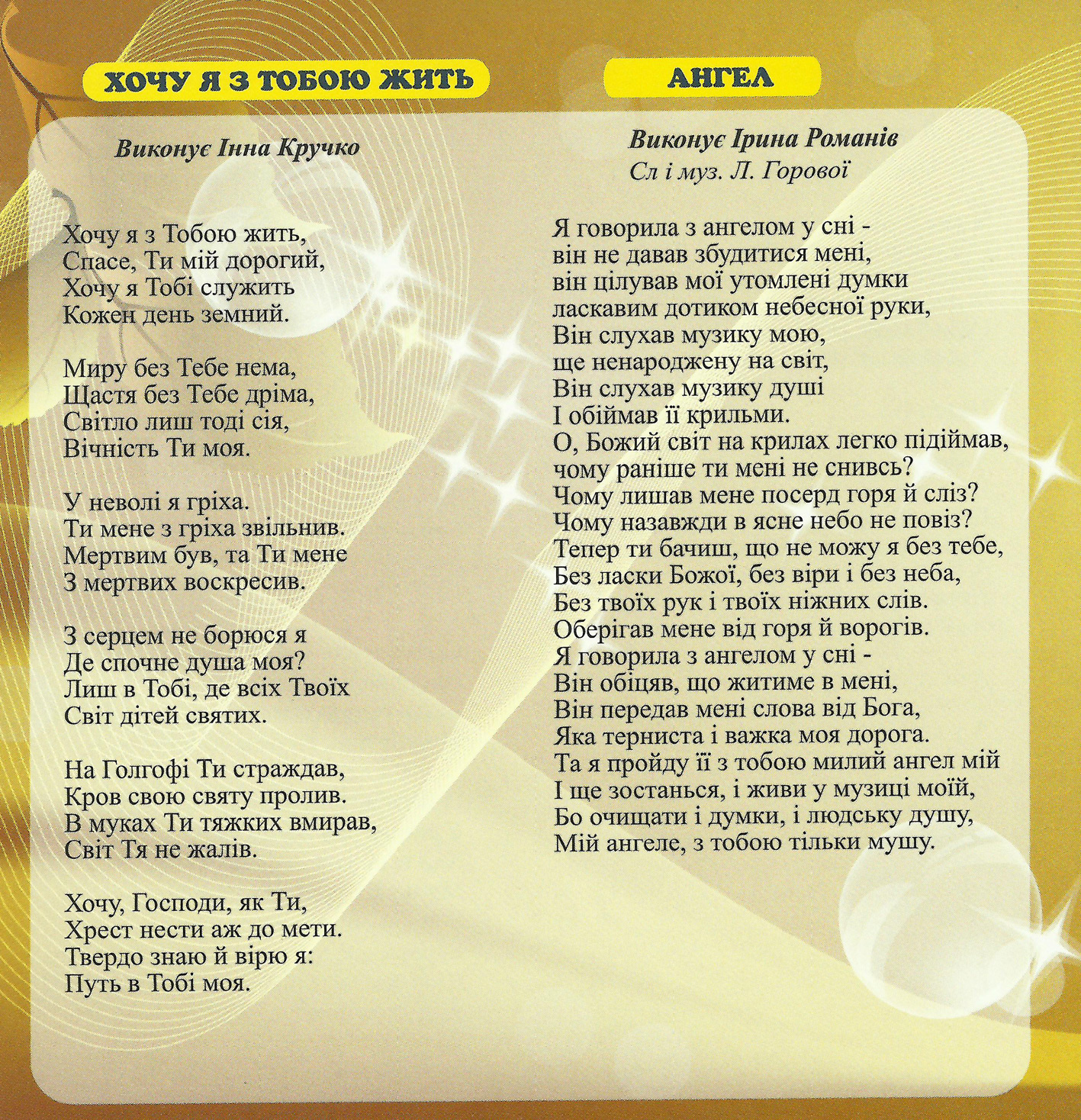 Формат flac (без втрати якості) 1. Пісня серця 10. Ангел 11. Воля Твоя 14. Молитва 16. Матінко Божая 17. Україно 18. Пісня серця (інструментальна) 19. Боже, дякую Тобі (інструментальна) Слухайте також: Поддерживайте создателей христианской музыки - покупайте лицензионные диски. Ищите в продаже в интернет магазинах.