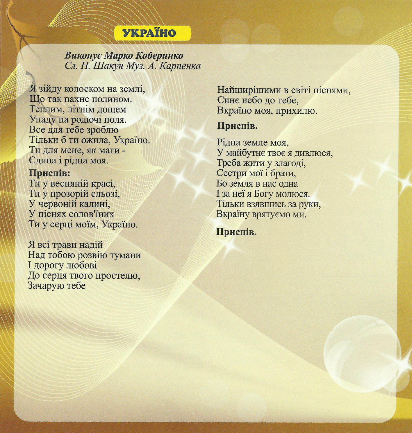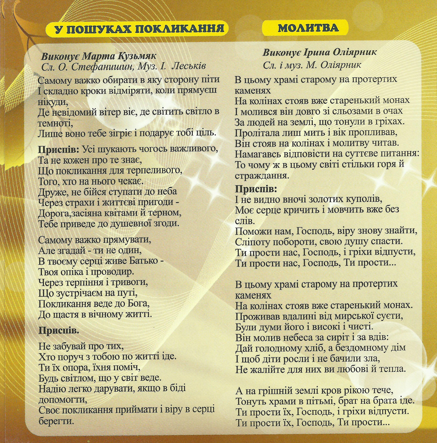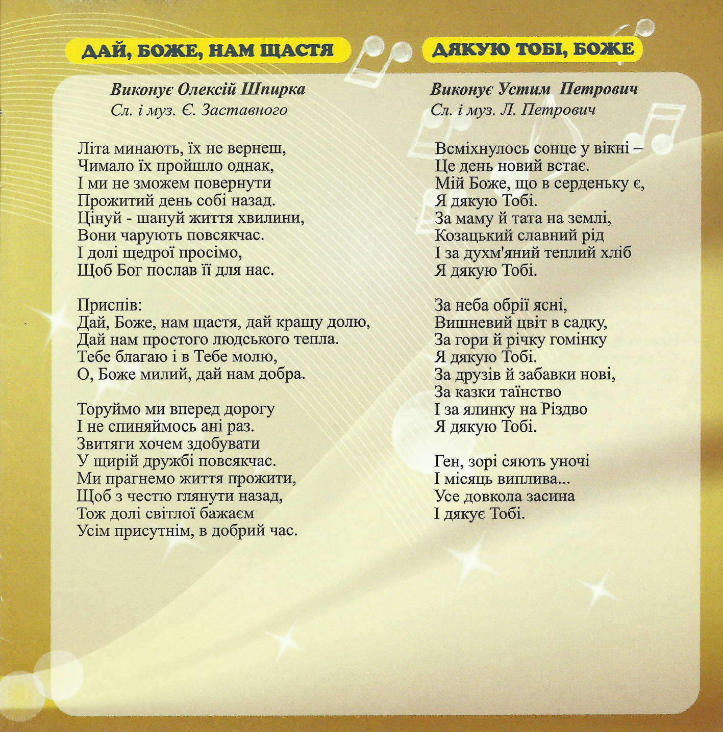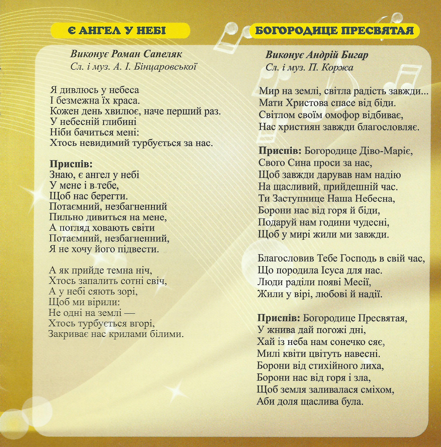 Формат flac (без втрати якості) 1. Пісня серця 10. Ангел 11. Воля Твоя 14. Молитва 16. Матінко Божая 17. Україно 18. Пісня серця (інструментальна) 19. Боже, дякую Тобі (інструментальна) Слухайте також: Поддерживайте создателей христианской музыки - покупайте лицензионные диски. Ищите в продаже в интернет магазинах.