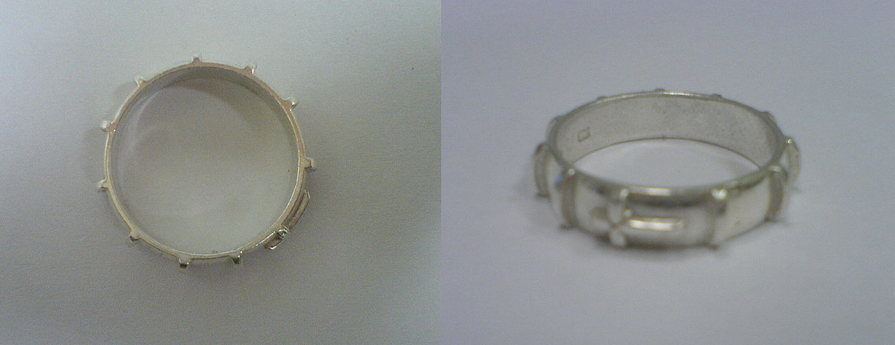 Коричневый: Верую Однодекадные розарииВо времена преследования католиков в Англии и Ирландии с 1540 года по 1731 год за ношение католической атрибутики можно было получить серьёзное наказание. Вследствие этого появлялись компактные, скрытые формы розариев, такие как ирландский розарий и кольцо-розарий для скрытого ношения. Кольца-розарии также назывались солдатскими, потому что их часто брали с собой на битву солдаты. Данный тип представляет собой кольцо с десятью отметками и крестом, что означает одну декаду розария. Подобное кольцо носится, как правило, на указательном пальце правой руки и при использовании чаще всего помещается на вторую фалангу пальца для обеспечения свободного вращения кольца. Также встречаются кольца-розарии, составленные из двух частей — собственно кольца и подвижной шины с отметками и крестом. Кольца такой конструкции удобнее в применении и не требуют снятия с первой фаланги при использовании. Особое кольцо-розарий употреблялось также басками. Серебряное кольцо-розарий ВенчикиЧётки розария также используются верующими для чтения так называемых венчиков — особых молитв, читающихся в определенной последовательности.