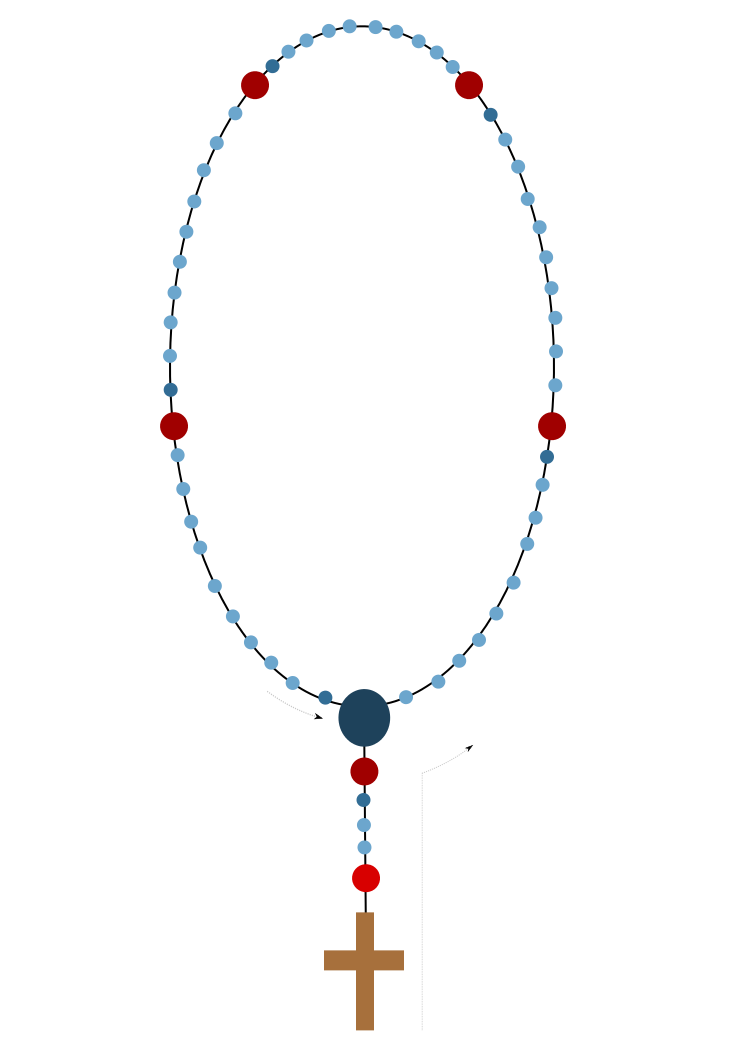 ИсторияПервые упоминания об использовании схожих с Розарием молитв по чёткам в христианских монастырях относятся к IX веку. Первоначально по 150 бусинам розария читались 150 псалмов Псалтири, и лишь впоследствии круг был разбит на десятки, разделённые большими бусинами, и вместо псалмов по нему читались Отче наш и Аве Мария. Современный вид чётки приобрели в XIII веке. Католическая традиция официально связывает их появление с явлением Девы Марии святому Доминику в 1214 году. Особую роль в распространении молитвы Розария сыграл орден доминиканцев в XV веке. Именно с этой молитвой традиция связывает победу католической Европы над турками при Лепанто, в память о которой был установлен праздник Девы Марии — Царицы Розария (7 октября). По католическому учению Дева Мария в своих явлениях в Лурде (1858 год) и Фатиме (1917 год) подтвердила необходимость чтения Розария. После того, как Католическая церковь признала Фатимские явления Девы Марии, Розарий был дополнен Фатимской молитвой. В 2002 году Иоанн Павел II добавил к имеющимся трём группам тайн ещё одни — светлые (см. ниже), не обязательные, но рекомендованные. ОписаниеКлассические чётки для Розария состоят из заключённых в кольцо 5 наборов из десяти малых бусин и одной большой, а также трех малых, одной большой бусины, распятия (креста) и медальона. Существуют также другие, менее распространенные разновидности. Молитва Розария, читаемая по чёткам, представляет собой чередование молитв Отче наш, Радуйся, Мария и Слава, которым должны сопутствовать размышления о тайнах, соответствующих определённым евангельским событиям. Дева Мария передаёт розарий святому Доминику. Гвидо Рени , 1596—1598 Виды тайнСуществует четыре вида тайн: